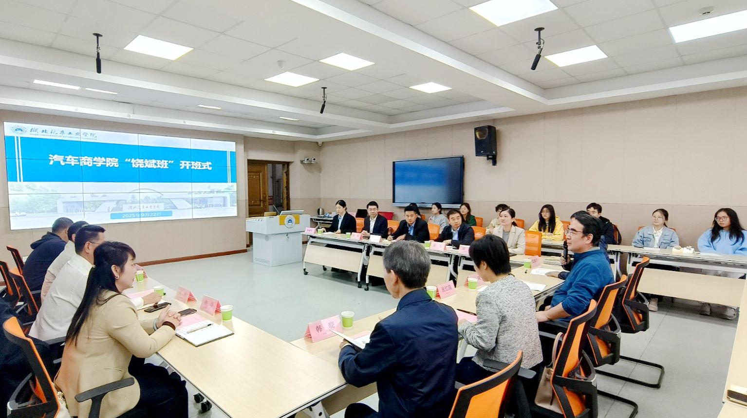 9月22日,我校首届“饶斌班”开班式在1305教室举行。校长王晓、副校长张红霞,东风物流高级经济师何平等企业导师,以及教务处、汽车商学院相关负责人、学术导师、班主任与19名首届学员参加开班式。